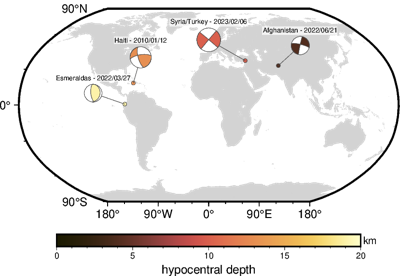 For GMT >=6.5.0, the fontsizes of the colorbar x-label, x-annotations, and y-label are scaled based on the width of the colorbar following \(\sqrt{colorbar\_width / 15}\). To set a desired fontsize via the GMT default parameters FONT_ANNOT_PRIMARY, FONT_ANNOT_SECONDARY, and FONT_LABEL (or jointly FONT) users have to divide the desired fontsize by the value calculated with the formula given above before passing it to the default parameters. To only affect fontsizes related to the colorbar, the defaults can be changed locally only using